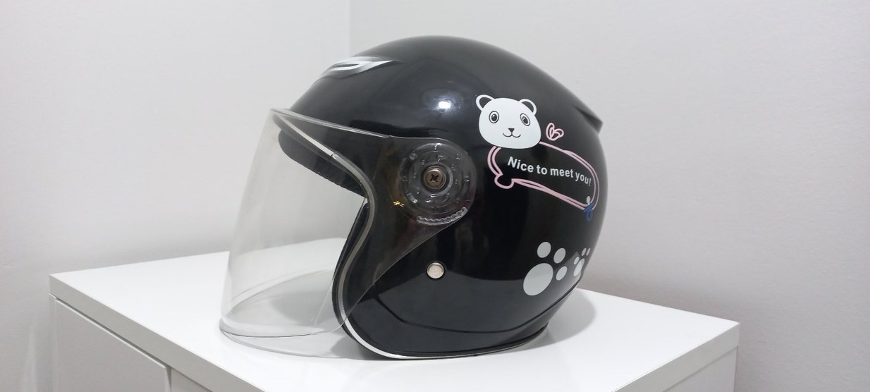 Parlak siyah plastikten yapılmış, renkli leopar desenli ve şeffaf vizörlü motosiklet kaskı. Üzerinde 'Nice to meet' yazısı ve sevimli ayı figürü bulunur.
