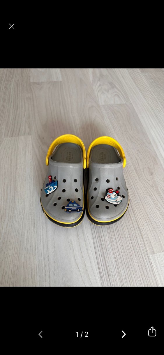 Gri çocuk terliği CROCS marka , sarı tokalı bant ve eğlenceli baskılı süslemelere sahip, trend sokak stili için uygun. Sadece bi ay giyildi hiç bir kusuru yok