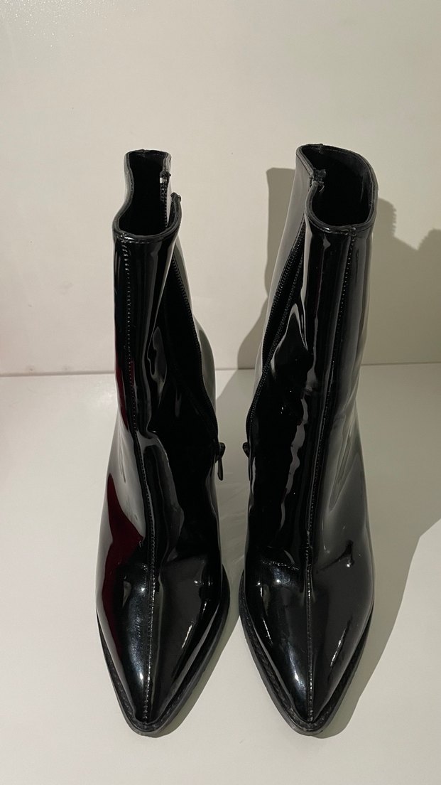 Parlak siyah lastik malzemeden, stiletto topuklu, desensiz gotik tarzda kadın botu. Romantik akşamlar için uygun. Marka temsili yurt dışından geldi