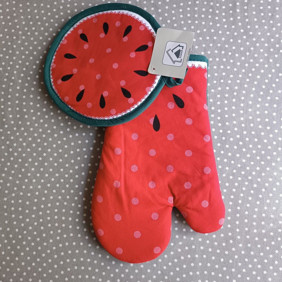 Karpuz desenli, noktalarla renkli fırın eldiveni ve tutağı seti.