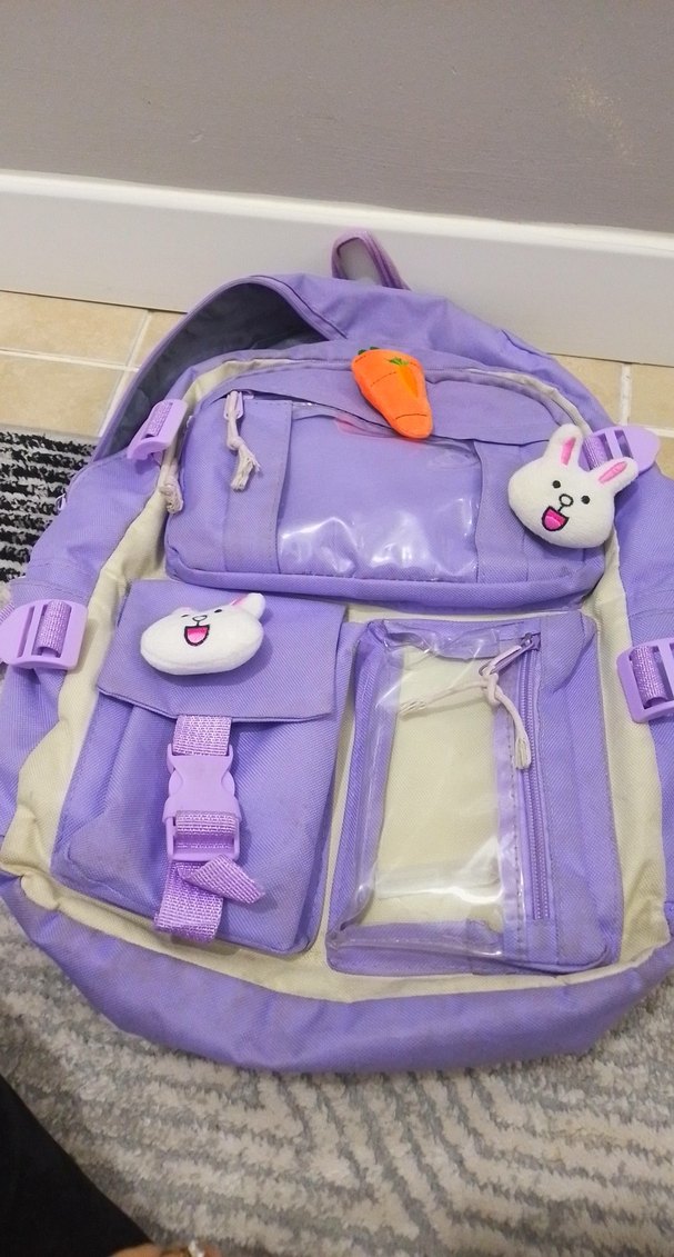 Mor pastel renkli çocuk okul çantası, çeşitli şeffaf ve kumaş cepleri ile sevimli oyuncak süslemelere sahip.
