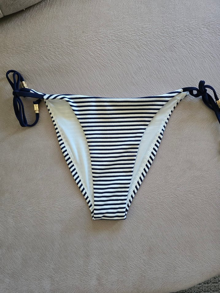 Çizgili desenli, elastik yanları ve bağcıklı tasarımıyla ayarlanabilir, vücuda oturan bikini altı. Plaj için Paris sokak stili havasında. ️