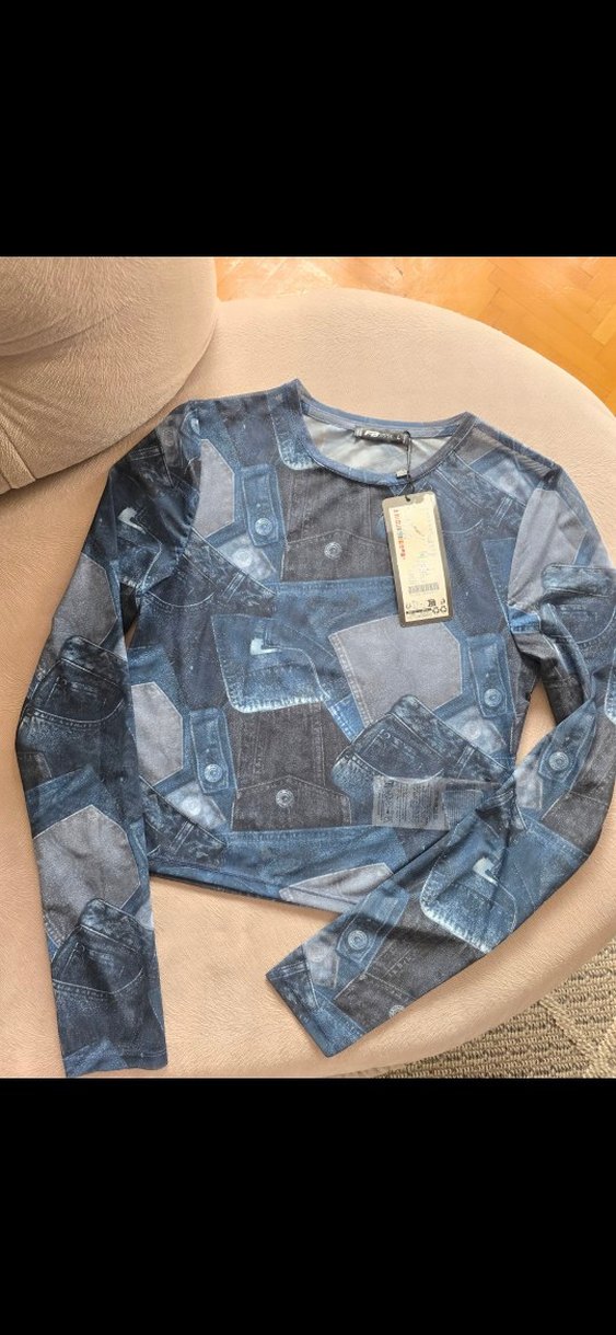 yurt dısından Newyorker Gri Baskılı Denim Görünümlü Kadın Bluz