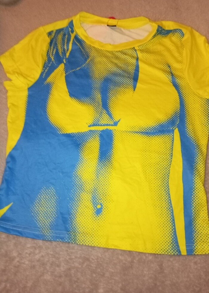 Sarı ve lacivert renk uyumu polyester kaygan kumaş XL olarak aldım etiket XL cok canlı ön kısmında bikinili gögüs resmi var