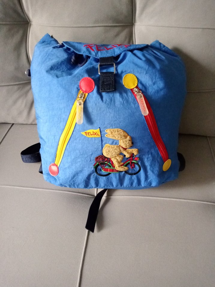 Yurtdışı ürünü Alman Felix marka Mavi renkte, Paraşüt kumaş,renkli fermuar detayları ve bisiklet süren tavşan figürlü çocuk çantası. Ayarlanabilir askılı ve toka kapamalı.