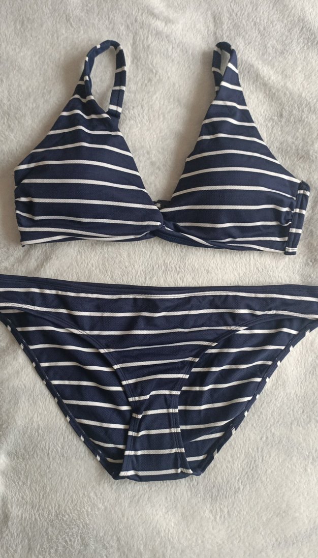 İngiltere'den, hiç giyilmedi.Lacivert ve beyaz çizgili, askılı, vücuda oturan bikini takımı. Bohem tarzıyla plajda şık bir görünüm sunar.
