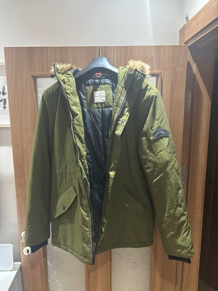 Kürk detaylı kapüşonlu, haki renkli, orta boy erkek/çocuk mont. Uzun kollu, normal kesim ve yaka detayıyla günlük ve sokak stiline uygun. S/M beden