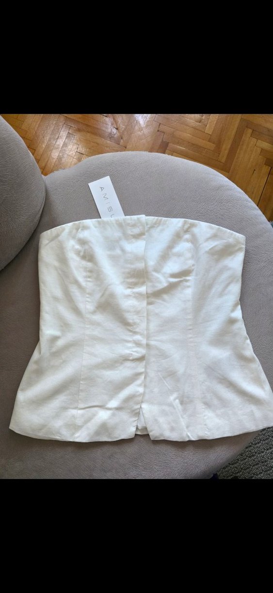Düğmeli, keten kumaştan beyaz straplez büstiyer, minimal ve çağdaş tasarımıyla ofis kullanımı için uygundur.