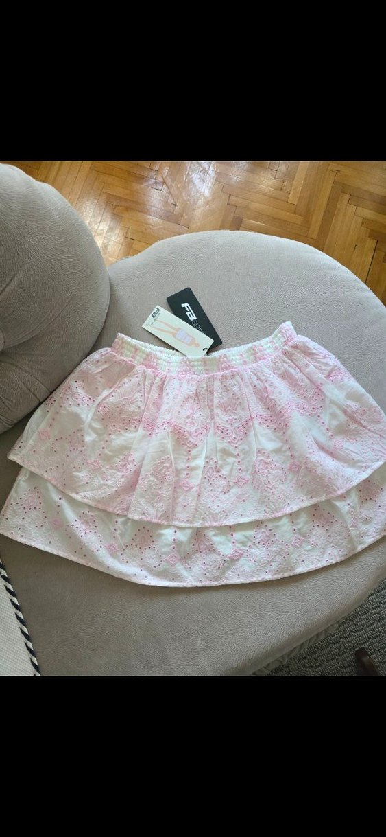 Pamuk kumaştan yapılmış, pastel pembe renkli, nakışlı ve fırfırlı detaylara sahip bol kesim bohem tarzda etek #newyorkeretek