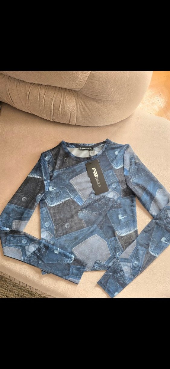 #fbsister #newyorker Mavi ve gri tonlarda baskılı denim desenli, düğmeli manşetli, uzun kollu ve kısa kesim dar kesim bluz. Sokak tarzı için uygun.
