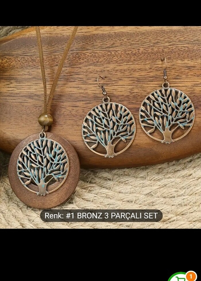 Yurtdışından hayat ağacı temalı takı seti, kolye ve bir çift küpeden oluşmakta. Son fotoğrafta ölçüleri mevcut