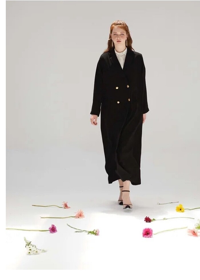 Hiç giyilmedi, etiketli. Site fiyatı 3.200 TL Gold düğme detaylı uzun ceket boy 140 cm önü cep detaylı kuşaklı kumaşı oskar krep