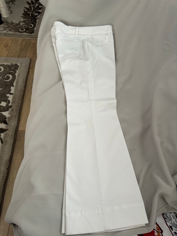 Kadınlar için beyaz pamuklu kumaştan, ispanyol ve normal boy midi pantolon. Minimalist, normcore tarzıyla ofis için uygundur. Düz ve sade tasarım. Hiç giyilmedi
