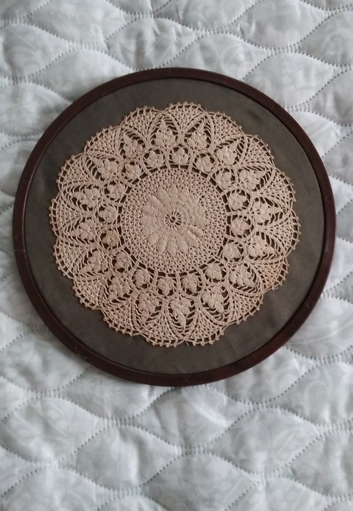 Yuvarlak ahşap çerçeve içinde ince işçilikle yapılmış bohem tarzda dantel süs.