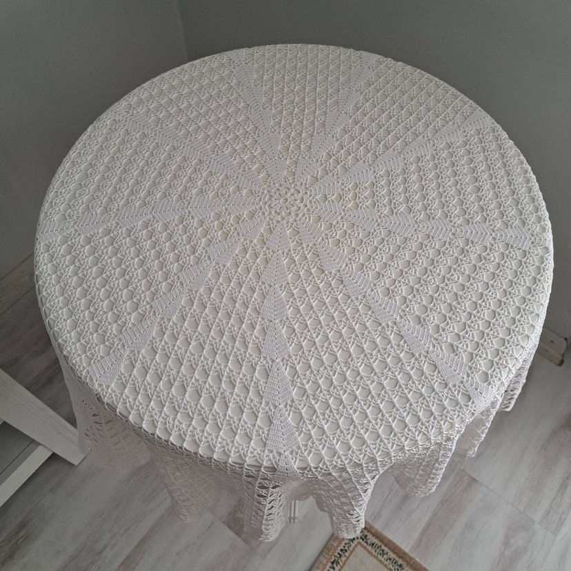 Yuvarlak, detaylı desenlere sahip dantel masa örtüsü, masanıza geleneksel bir hava katıyor.