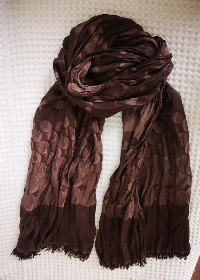 Hiç kullanılmadı. Büyüklü küçüklü puantiyeli, polyester, çok hafif,parlak kumaş. Şık, uç kısımları kısa püsküllü. Boy 182, en 59 cm.