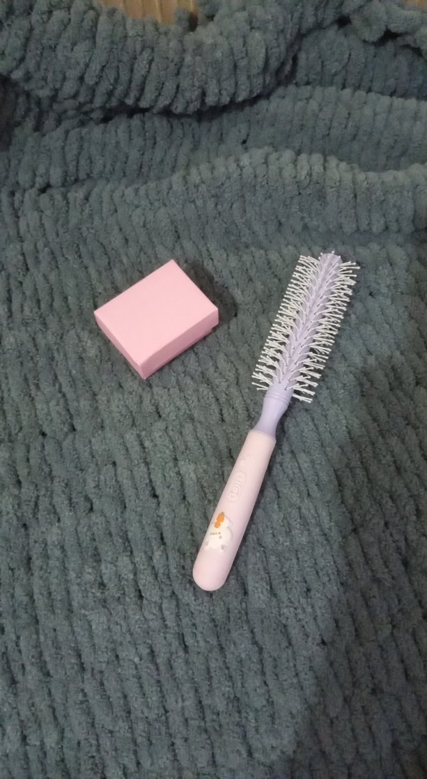 Yuvarlak beyaz kıllı saç fırçası ve küçük pembe kutu, Fırçanın açık mor sapında küçük bir desen bulunuyor.