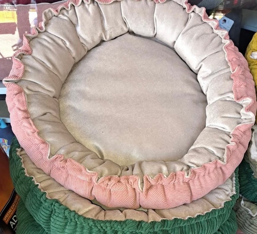 Yumuşak keten kumaştan yapılmış, pastel pembe renkte, fırfırlı kenarlı ve desensiz kedi yastığı