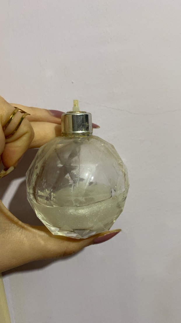 Yuvarlak kesimli, gümüş kapaklı kadın parfüm şişesi, yarı dolu saydam sıvı içeriyor. Şişe dokulu yüzeye sahip. Doldurma sprey kutılarına kafasından koyabilirsiniz deniz kokulu bir parfümdür markası orflime