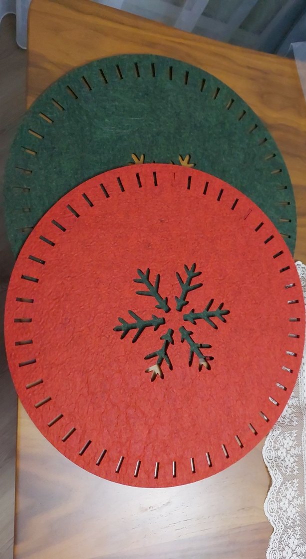 Yumuşak malzemeden, renkli tasarımlı ve kesik kar tanesi desenli yuvarlak kırmızı ve yeşil 2 li❄️AMERİKAN SERVİS.37×37 CM .Keçeden yapılma.