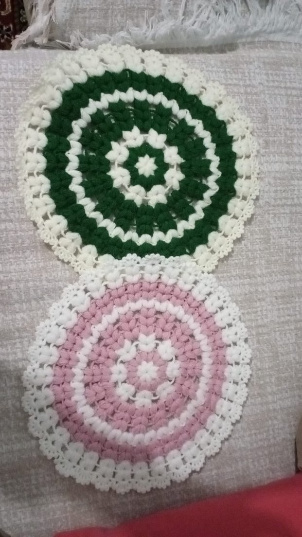 Yeşil ve pembe renklerde, beyaz detaylı yuvarlak el yapımı lif seti.