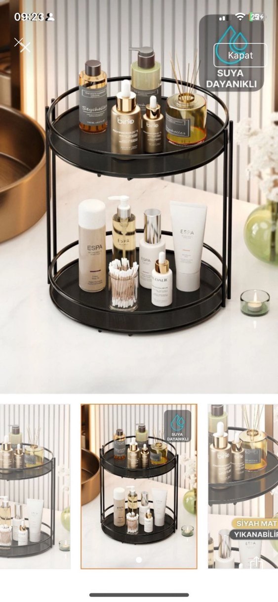 İki katmanlı, siyah metal çerçeveli yuvarlak makyaj düzenleyici. Kozmetik şişeleri ve aksesuarlar için dayanıklı ve şık tasarım.