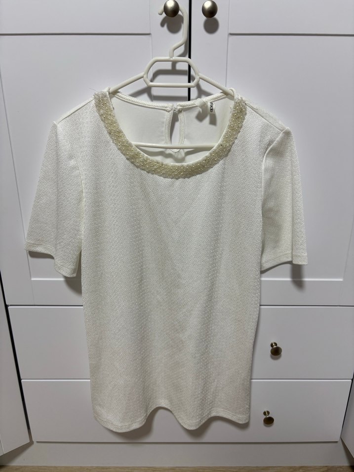 Yuvarlak yakalı, kısa kollu beyaz kadın bluz. Günlük kullanıma uygun Yaka kısmında birkaç boncuk sökülmüş durumda ama belli olmuyor pek , birkaç defa giyildi