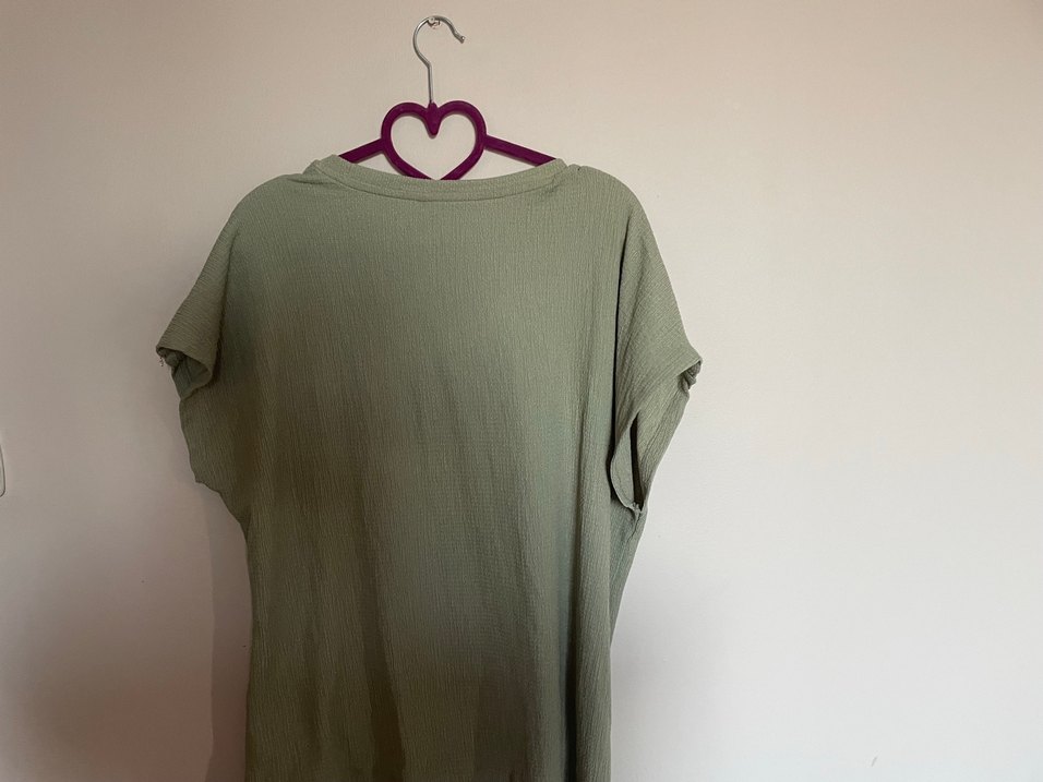 Yuvarlak yakalı, kısa kollu, uzun kesim yeşil Yumuşak keten kumaştan, pastel yeşil renkte,bol yapısıyla minimalist bohem tarzda. Günlük kullanıma uygun.