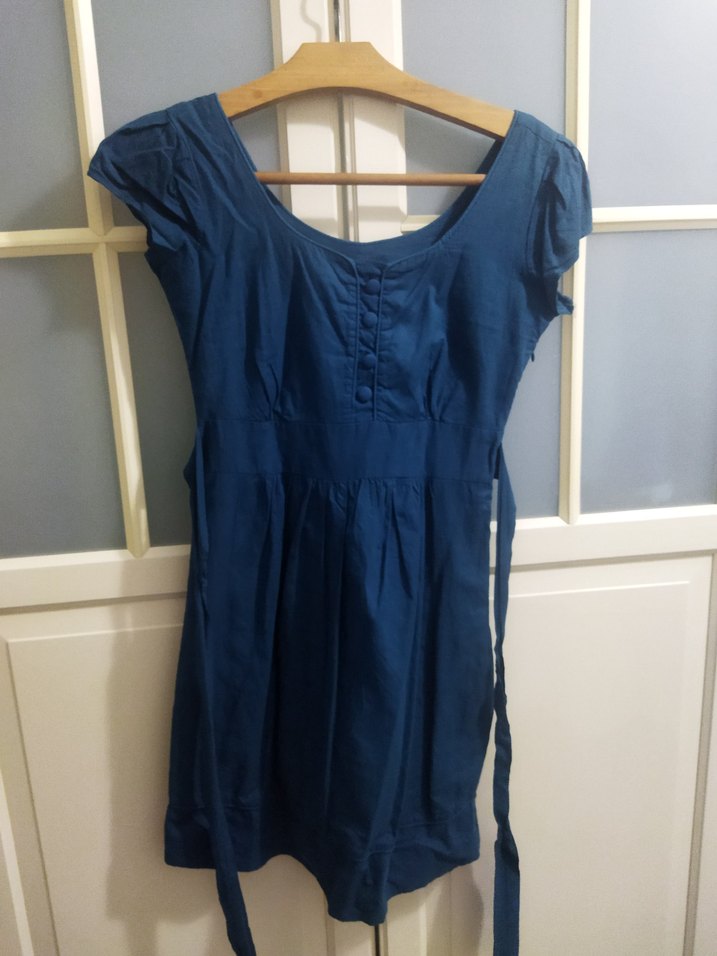 Lacivert keten midi elbise, kısa kollu, bol kesimdir. Bel detaylıdır ve vintage bohem tarzındadır, günlük kullanım için uygundur.
