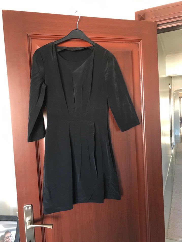 Yuvarlak yaka, uzun kollu siyah midi elbise, pile detaylı ve vücuda oturan kesime sahiptir. Desensiz ve ofis için uygundur.Boy 80 cm iki kol arası 42 cm bel 32 cm ön kapak detay