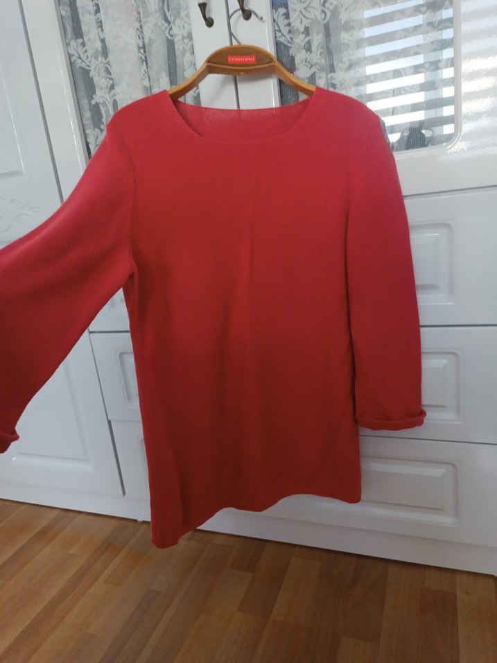 yuvarlak yakalı, uzun kollu, bol kesim ve normal boyda kazak. Yumuşak örme kumaştan yapılmış, parlak ve sade tasarıma sahip, günlük kullanıma uygun.