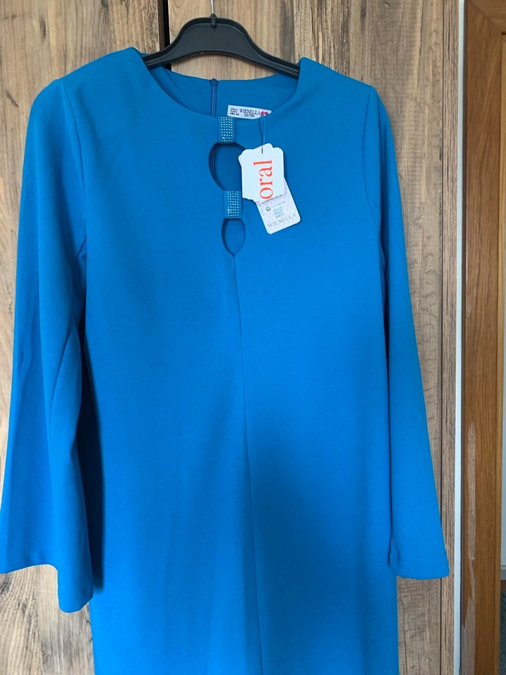 Uzun kollu, yuvarlak yakalı mavi elbise, taş detaylı, Yumuşak ve sıcak kumaştan, romantik akşamlar için uygun.