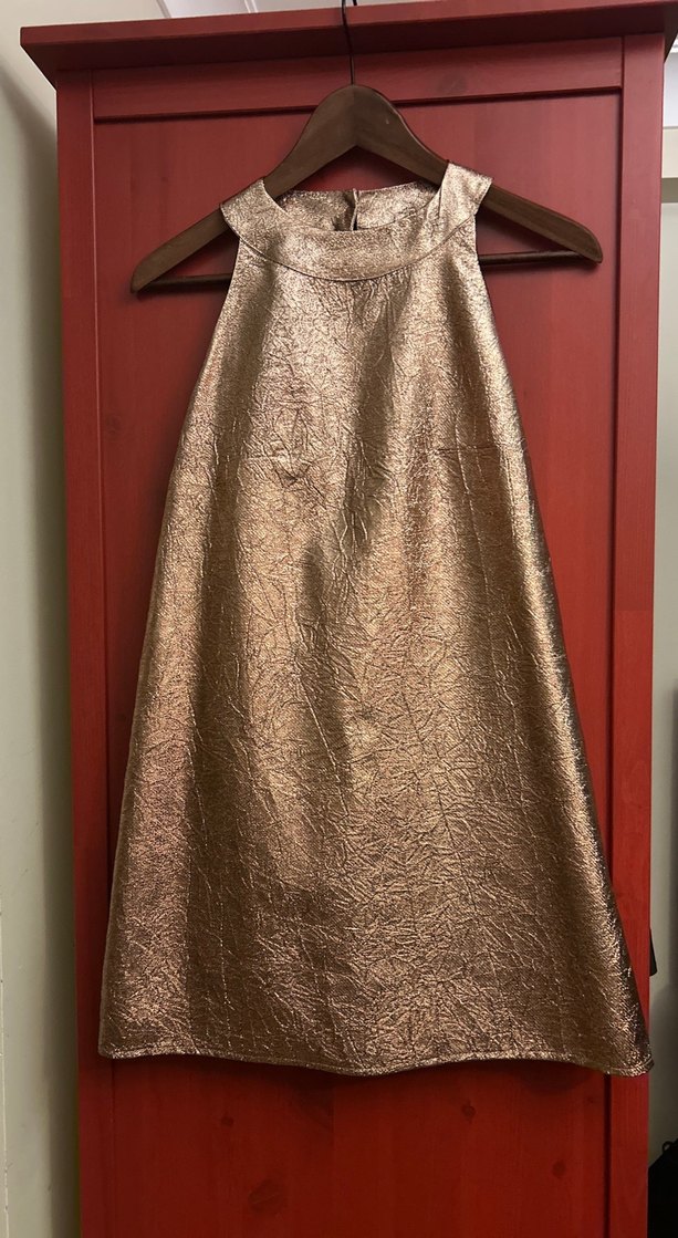Kahverengi parlak yılan desenli, yüksek yakalı ve kolsuz kadın gece elbisesi. Fermuarlı ve vücuda oturan kesimiyle vintage ve bohem tarzı bir arada sunar.