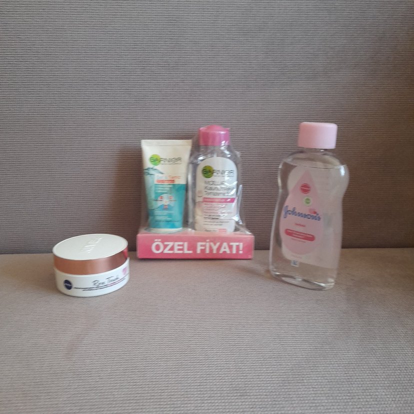Garnier makyaj temizleme suyu 125 ml,garnier saf ve temiz 50 ml,Johnson bebek yağı 200 ml ve Nivea Rose Touch yüz kreminden oluşan bir set.Kapatan mağaza ürünleridir.