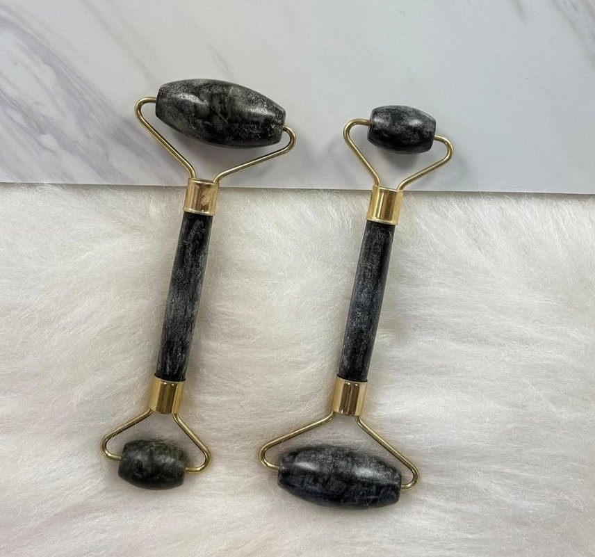 Diger siyah-gri taşlı, çift başlıklı cilt masaj aletleri. Pürüzsüz taş yüzeyli ve altın renk metal saplıdır.
