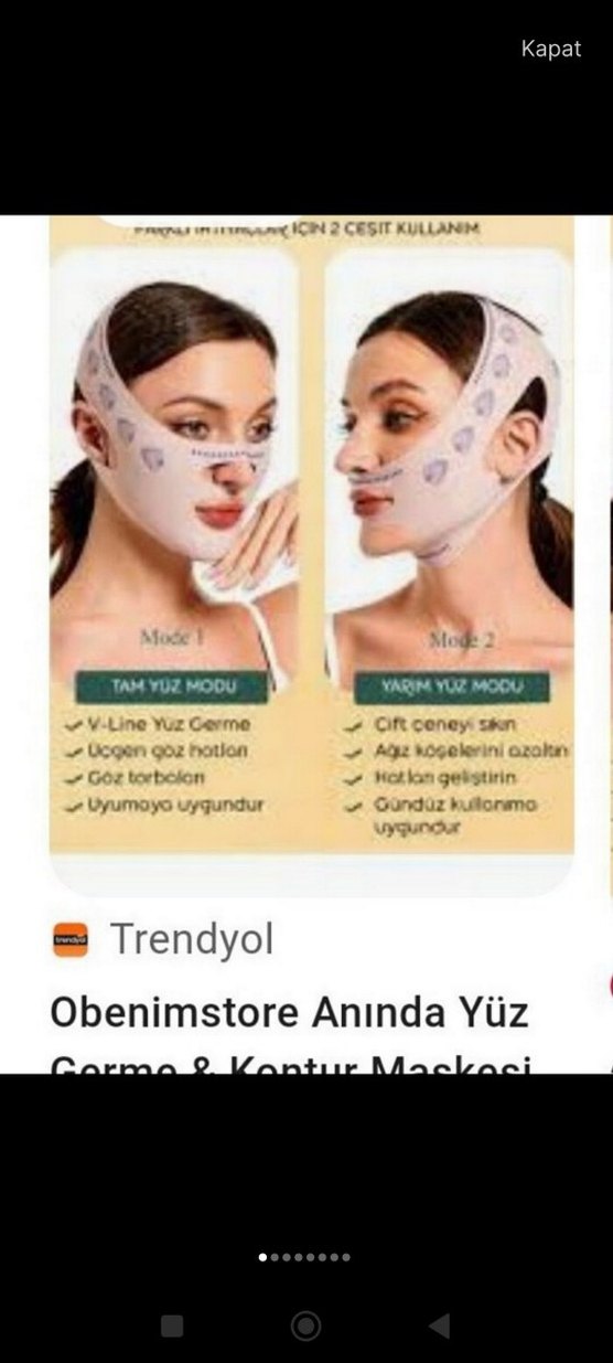 Tam yüz modu V-line yüz germe, göz hattı kaldırma ve uykuya uygunluk sağlar. Yarım yüz modu çift çene azaltma, kırışıklık yumuşatma ve gündüz kullanımı içindir. ♀️