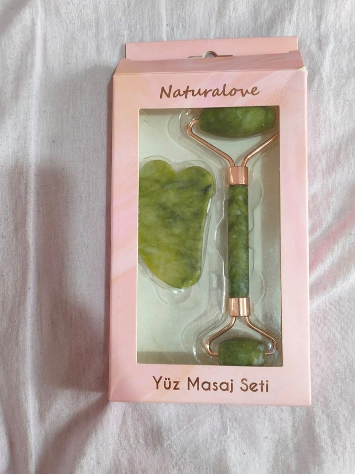 Yüz masaj seti, cilt rahatlatmak ve dolaşımı artırmak için jade rulo ve gua sha aracından oluşur.
