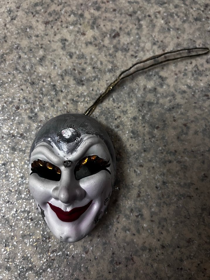 Gümüş renkli, detaylı yüz ifadelerine sahip dekoratif yüz maskesi. Asmak için ipli.