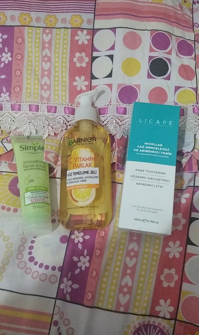 Yumuşak yüz peelingi, C vitamini temizleme jeli ve gözenek sıkılaştırıcı micellar tonik içeren cilt bakım seti.