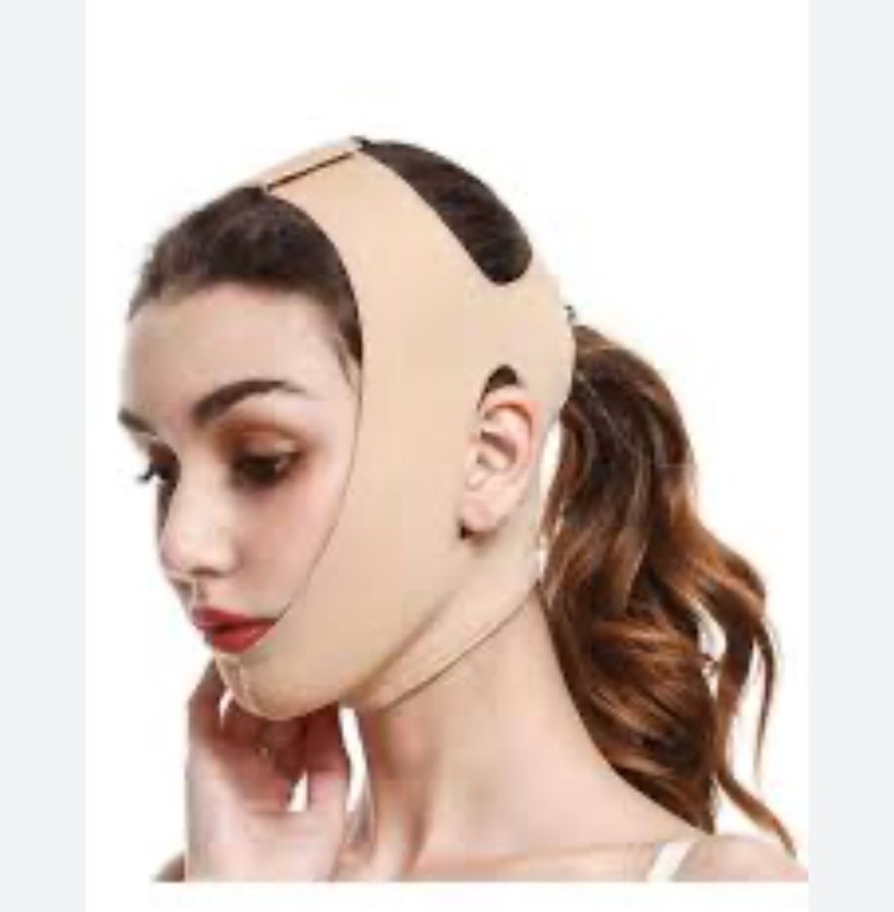 Bej renkli yüz ve çene destek maskesi, hafif sıkıştırma ve destek sağlar. Ayarlanabilir yapısıyla konforludur.
