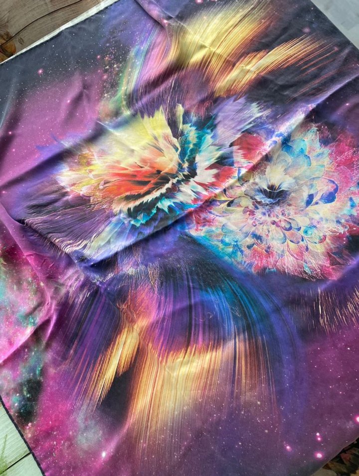 Kadınlar için ipek dokulu, koyu ve canlı çok renkli tasarıma sahip şal. Akıcı şekilde drapelenir, avangart ve pop kültür tarzına uygundur.