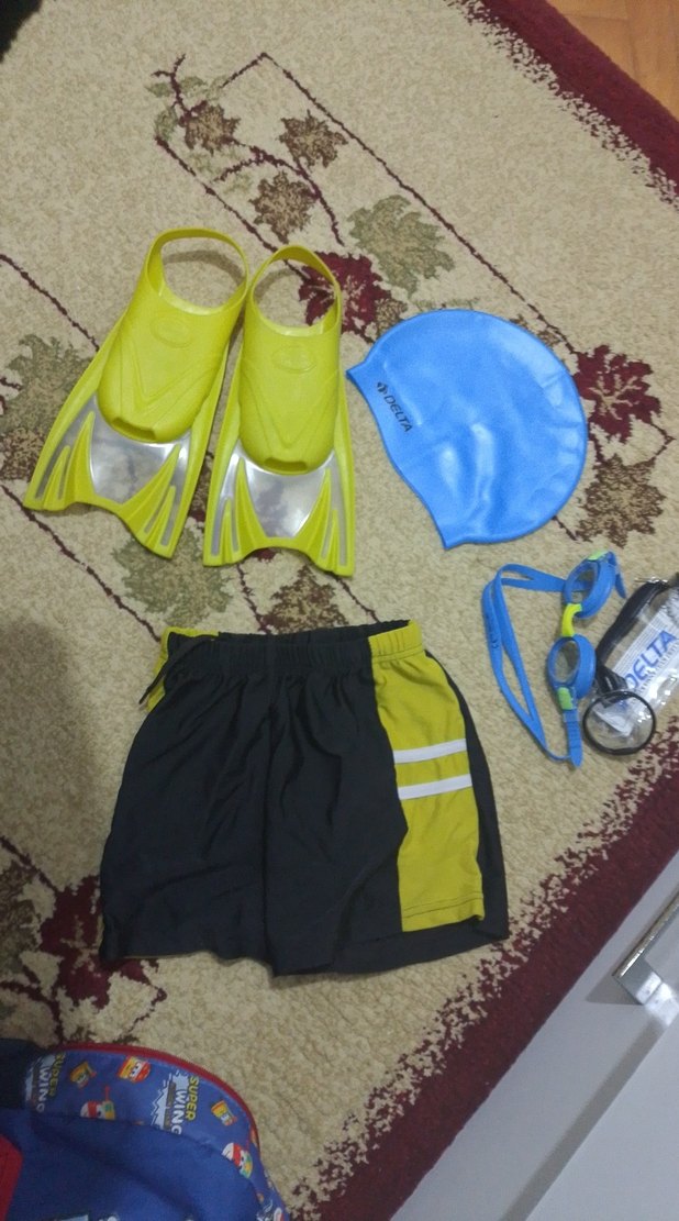 Sarı siyah renkte, kolsuz erkek çocuk mayo şortu. Sarı yüzme paletleri, mavi yüzme bonesi ve gözlükle tamamlanmıştır. ♂️