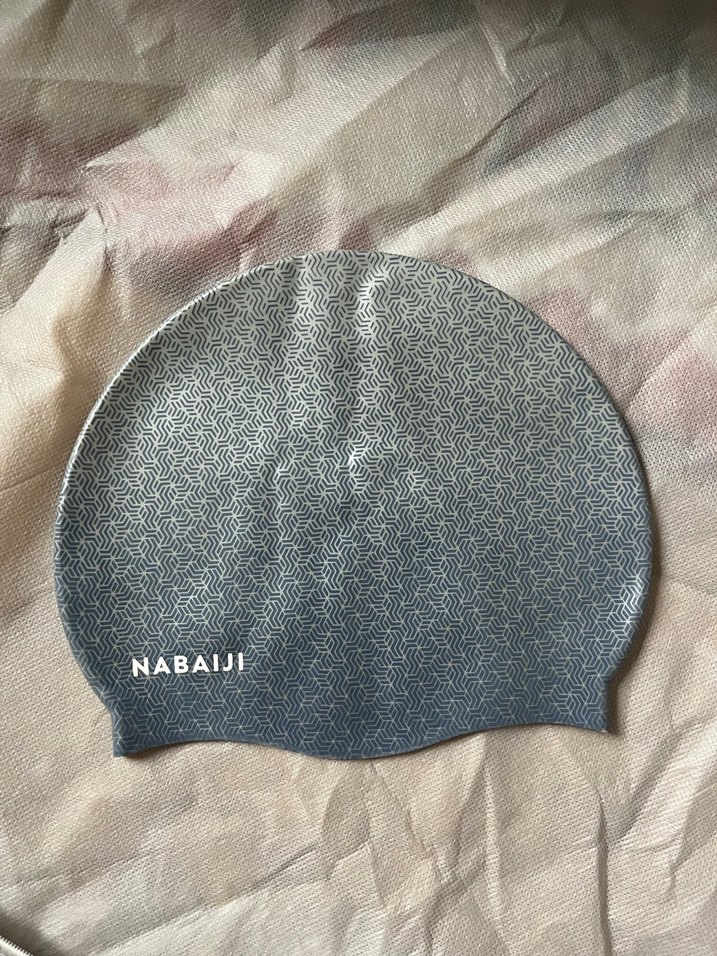 NABAIJI markalı gri renkli, geometrik desenli ve esnek yapıya sahip unisex yüzücü bonesi. Bir iki kez kullanıldı, temiz