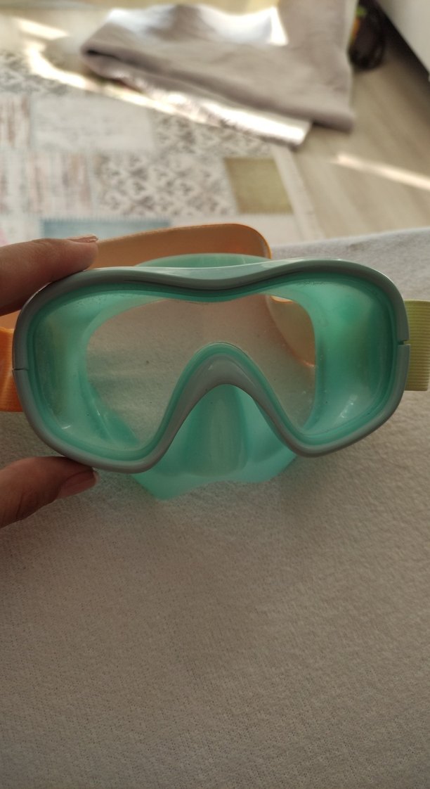 Turkuaz renkli, pastel turuncu tokalı ayarlanabilir bantlı, baskılı detaylı ve fit kesim Subea yüzücü gözlüğü. ️ dalış seti ama ağızlığı kayıp.