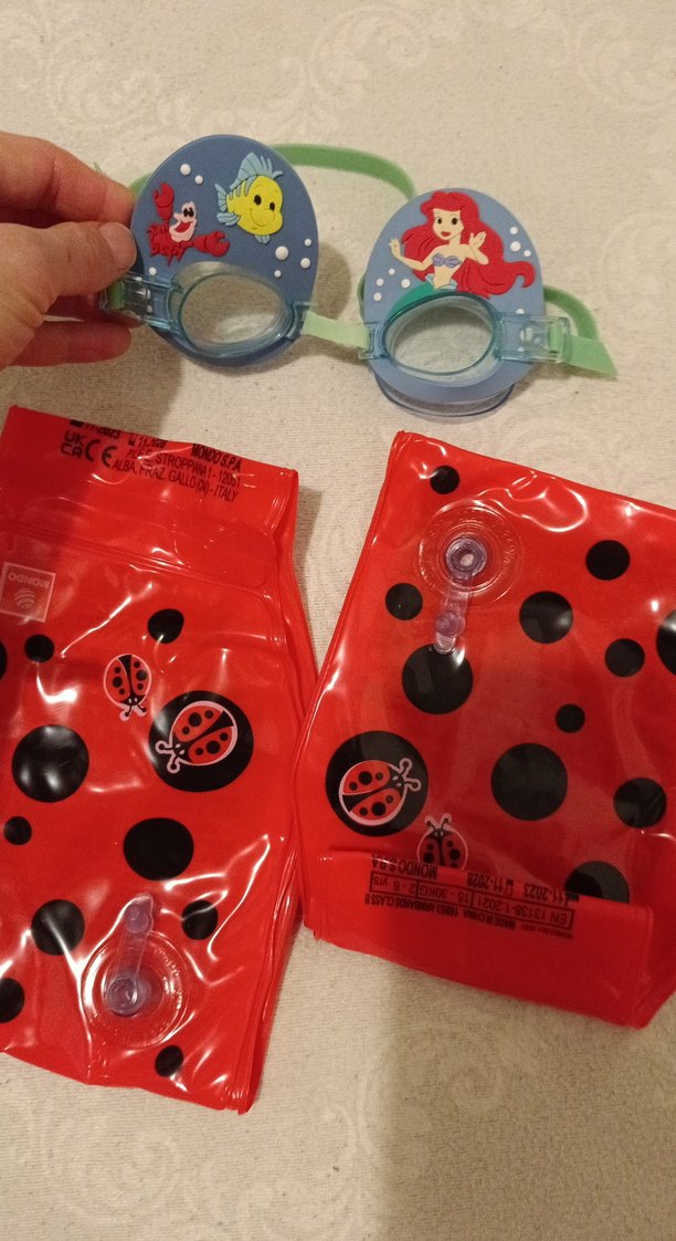 Deniz Kızı baskılı renkli yüzücü gözlüğü ve siyah uğur böceği desenli kırmızı şişme kolluk, Velcro bantlı.