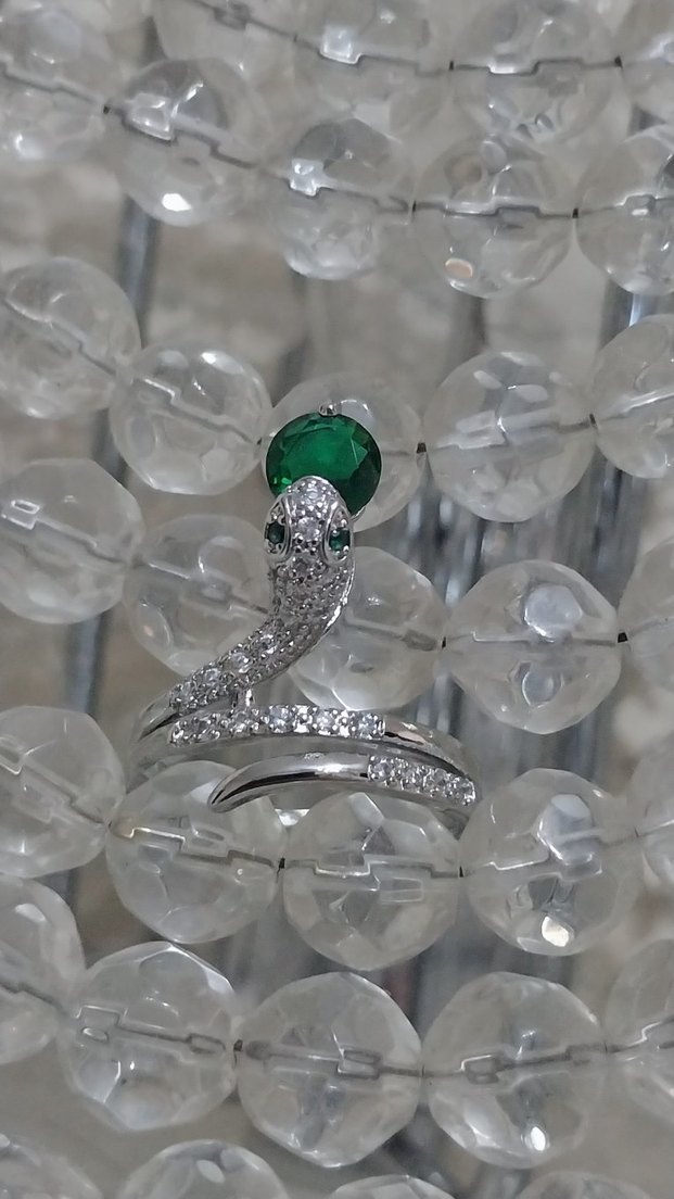 Kadın yüzüğü, yılan deseni ve parlak zümrüt taş ile süslenmiş, düğünler için uygun modern ve klasik şıklığı bir araya getirir.