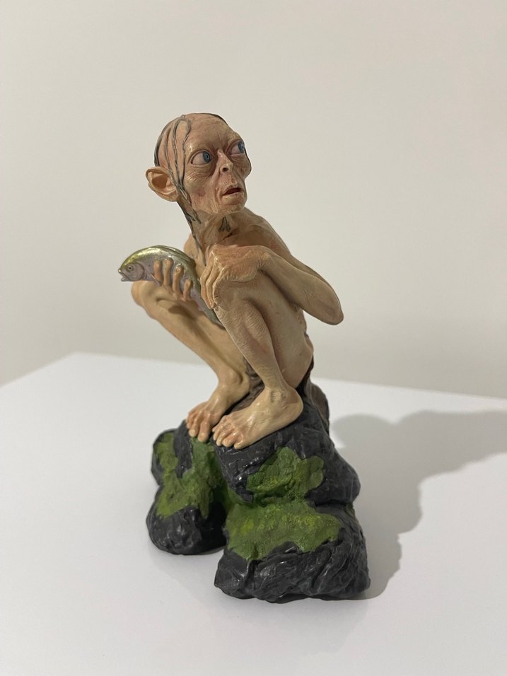 Yeşil yosun detaylı kayalık bir zeminde oturan, balık tutan koyu kahverengi Gollum aksiyon figürü. Boynunda ufak bir defosu var.