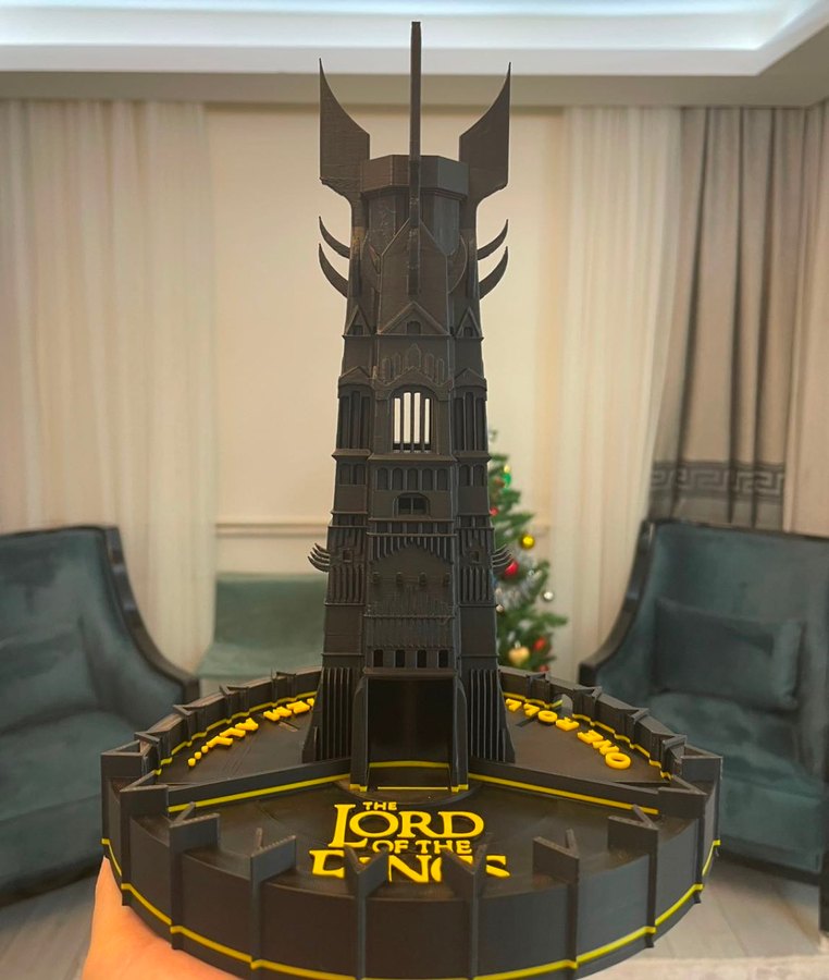 Yüzüklerin Efendisi temasında, koyu ve altın renkli detaylarla işlenmiş, mimari özellikleri öne çıkan kule figürü.
