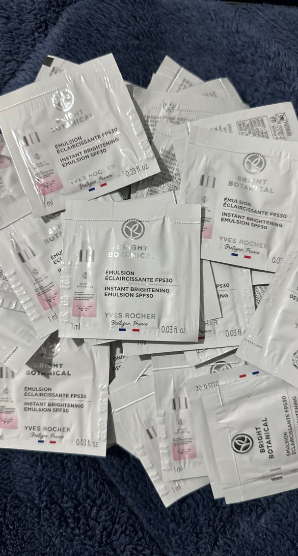 Yves Rocher Anında Aydınlatıcı Emülsiyon SPF30, hafif ve aydınlatıcı beyaz formülde 1 ml'lik paketlerde sunulmaktadır. ☀️