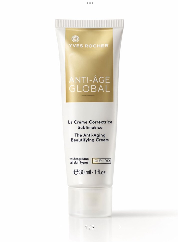 Yves Rocher Anti-Âge Global La Crème Correctrice Sublimatrice gündüz kremi. Yaşlanma belirtilerine karşı geliştirilmiş bu krem, cildin daha aydınlık, pürüzsüz ve canlı görünmesine yardımcı olur. İnce çizgi ve kırışıklık görünümünü azaltmayı hedefler. %7-10 dolu